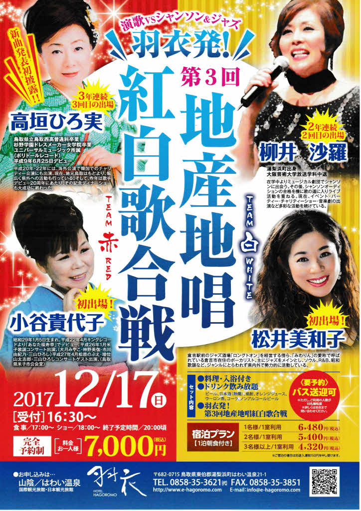 お近くの方は奮ってご参加ください。 ![]() 羽衣天女伝説の夕べ 鳥取県東伯郡湯梨浜町はわい温泉で開催されましたイベント「羽衣天女伝説の夕べ」にて、発表予定の新曲「天女のはごろも」を歌わせていただきました!